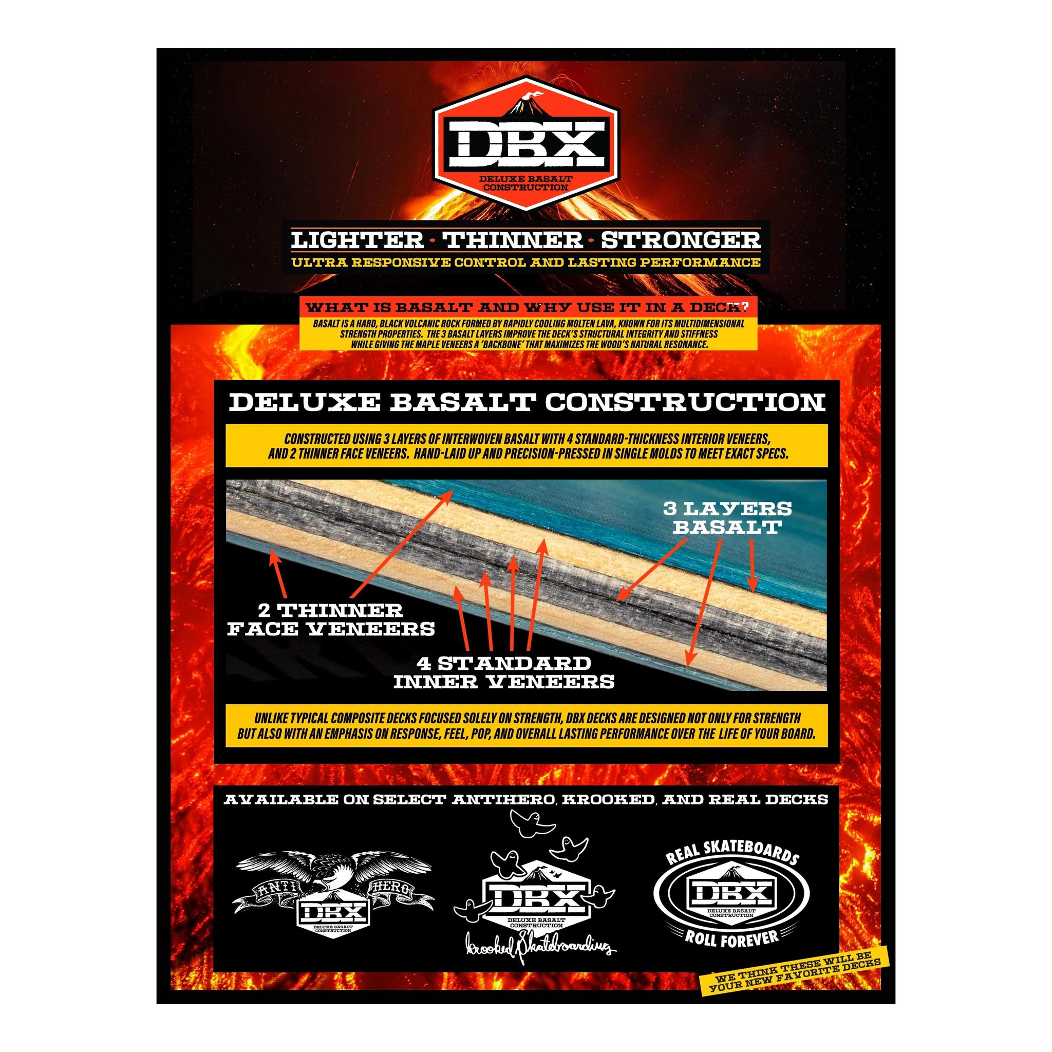 DBX decks are designed for an ultra-responsive, lightweight, and quick feel, maintaining consistent, long-lasting performance throughout the board’s lifespan. They are lighter, thinner, and stronger, with a snappier pop than traditional 7-ply decks.
