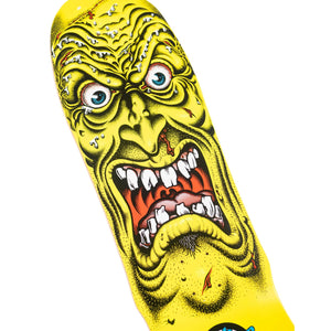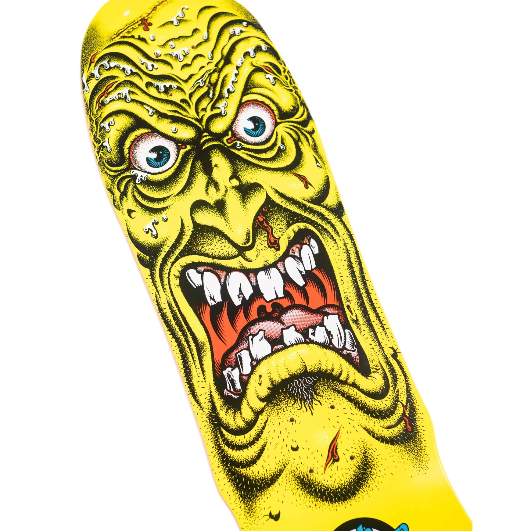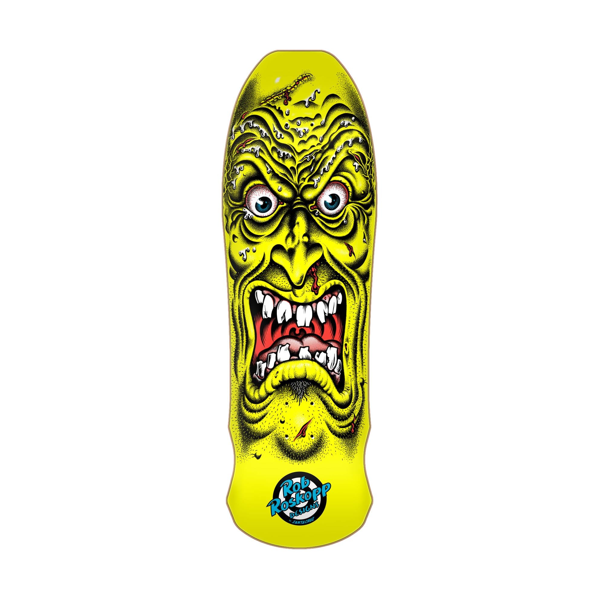 The Santa Cruz Skateboards Roskopp Face Reissue 9.5" x 31" deck features legendary Santa Cruz Rob Roskopp Face neon yellow artwork with a blue stain deck top on his OG reissue shape with a 14.75" wheelbase. View "DETAILS" for nose and tail lengths, concave, and more.