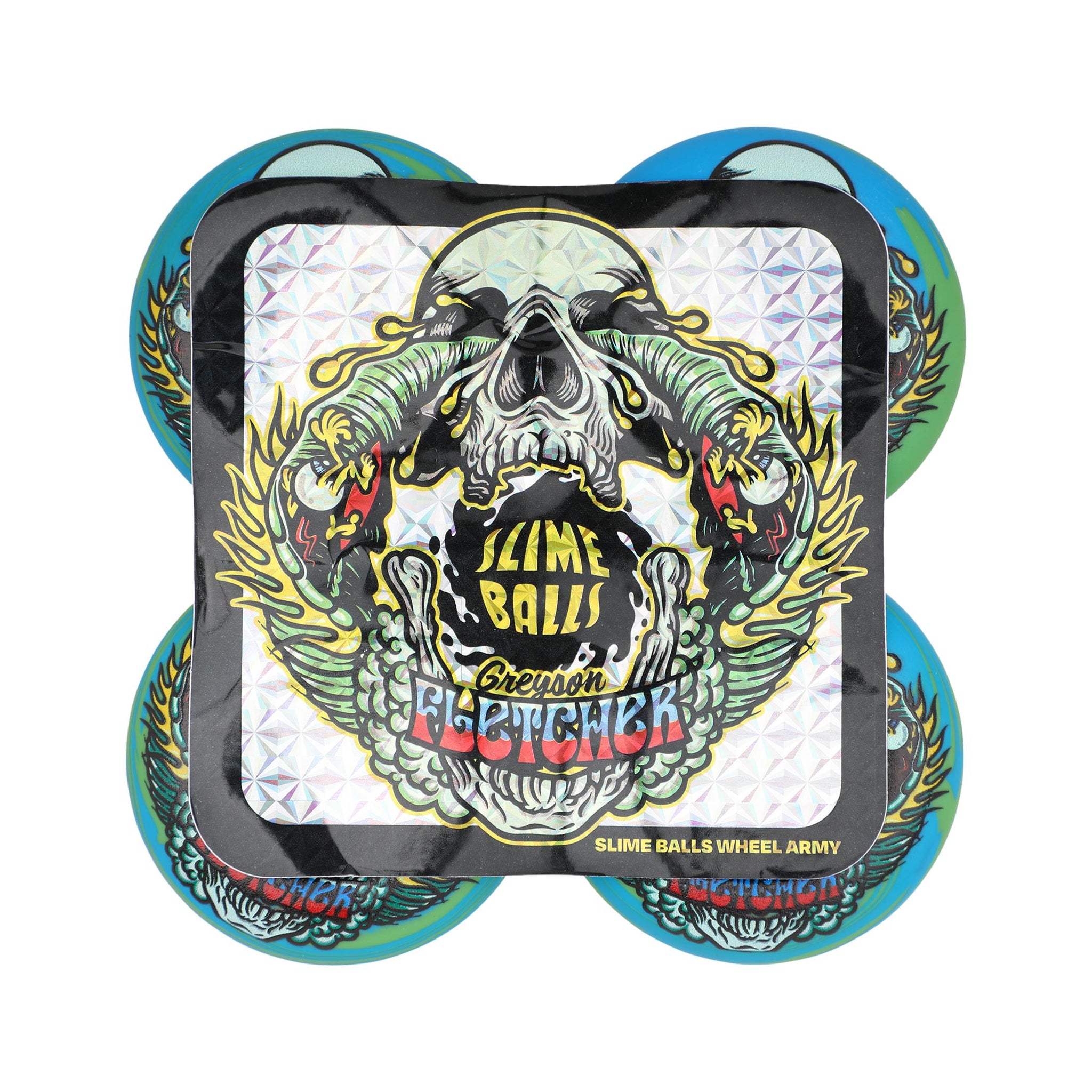 Slime Balls Greyson Fletcher Guest Chubbies 54mm, 99a Slime Balls Wheels feature blue / green swirl high performance 99a urethane on our super wide Chubbies shape and come with a Slime Balls Greyson Fletcher prismatic 3.5" x 3.5' decal.